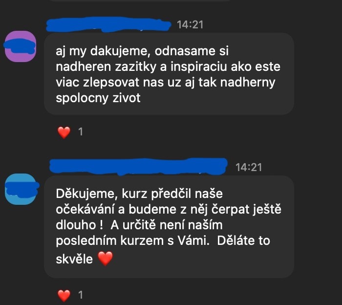 „Klobouk dolů, ta praxe a vaše zkušenosti jsou znát. Je vidět, že už to děláte řadu let, a hlavně, že to lidem OPRAVDU pomáhá. S manželkou nám to otevřelo úplně nové rozměry v našem vztahu. Byť jsme měli docela hezký vztah, nebyly tam žádné hádky ani nic podobného. Ale najednou jsme objevili nové příležitosti, které nás dříve ani nenapadly. Za to vám moc děkuju a myslím si, že tohle nebyla poslední aktivita, které jsme s manželkou dělali v rámci vašich programů.“