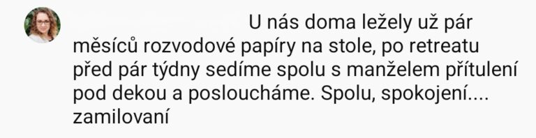 „Kurz byl skvělý, jsem z něj ještě teď nadšená. Bylo to přesně to, co jsme s mužem po 16 letech potřebovali - vztah osvěžit, dát nový rozměr intimitě, naučit se otevřeně sdělovat svoje emoce a přání... A dovoluji si tvrdit, že opravdu cítím, jako bychom se do sebe znovu zamilovali."