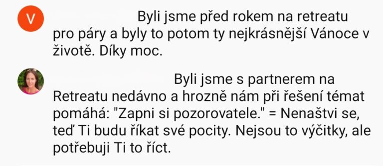 „Denisa a Richard jsou naprosto skvělí učitelé a toto by se mělo učit už ve škole, neboť člověk zbytečně zahodí spoustu let hádkami, přitom stačí málo a vše je najednou jiné."