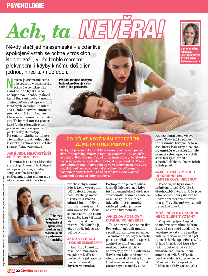 Ta se nevrátí ze dne na den. Podvedení zažívají mnohdy i tzv. posttraumatickou poruchu. To zanes, že když se například partner trochu někde zpozdí, přijde silná emoční reakce, opět vlna nedůvěry, panika. Podvedený člověk má také tendenci na všechno se doptávat a kontrolovat a nelze se na něj zlobit, protože tyto mnohdy silné reakce nemá zcela ve své moci. Tady může pomoct i individuální terapie. A také čas, který hojí rány a současně umožňuje partnerům, aby si mezi sebou opět vytvořili sérii hezkých prožitků a pocitů blízkosti, které jejich vztah posílí.