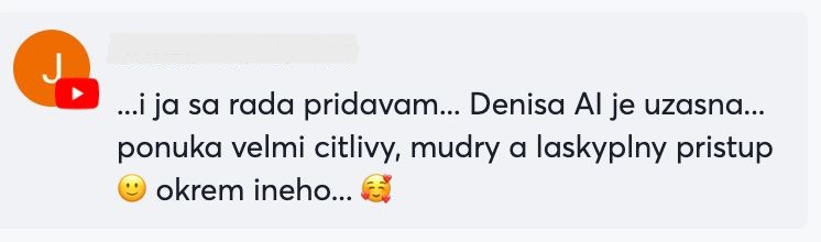 „Ahoj Deni, když si představovala AI, tak jsem si říkala to vůbec není pro mě, to mě nezajímá. Vysílání jsem dokoukala celé a byla jsem překvapená. Tak jsem si řekla, že to také zkusím. Musím říct, že naprosto perfektní načasování do tohoto období. Poskytla si opravdu obrovský dar. Byla jsem velice překvapena a zaskočená, jak Denisa AI má naprosto přesné odpovědi na, tak hluboké otázky!