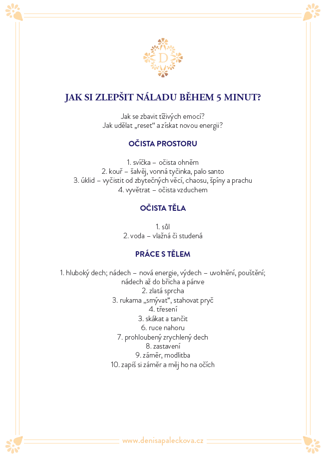 Milá Denisko, ráno mě čekal v emailu dárek k svátku ♥ toto video♥ moc za něj děkuji, po probuzení jsem se necítila dobře, ani fyzicky, ani psychicky, ale po shlédnutí Tvého videa je to už jinak, zatancovala jsem si, i když jsem na invalidním vozíku :)) Inspiruješ mě už několik let – knížky, videa, kurzy – a vždy si s Tebou ráda připomenu pro mě základní mechanismy, návyky, které mi pomáhají užívat si plně život, i přes různé situace, které zažívám 🙂 DĚKUJI♥