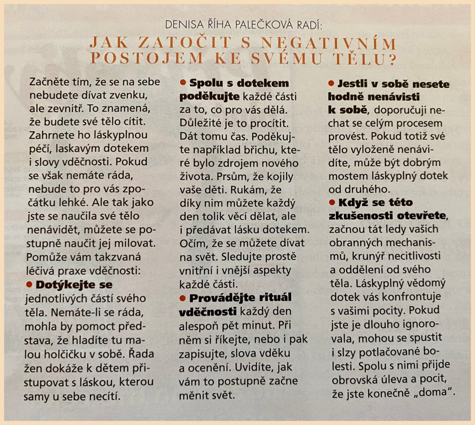 Jako úžasný krok na doma doporučuji praxi vděčnosti. Začneme se dotýkat jednotlivých částí těla, vědomě a láskyplně. A spolu s tím dotekem každé části těla děkujeme, co pro nás dělala a dělá. Důležité je to nejen pomyslet, ale i procítit. Dát tomu čas. Například poděkujeme prsům, že kojily naše děti a podporovaly nový život. Rukám, že díky nim každý den můžeme tolik věcí dělat i předávat lásku dotekem. Očím, za to že se díky nim můžeme na svět dívat, a třeba i za to, že jsou tak krásně hluboké a podmanivé. Díváme se na vnitřní i vnější aspekty.