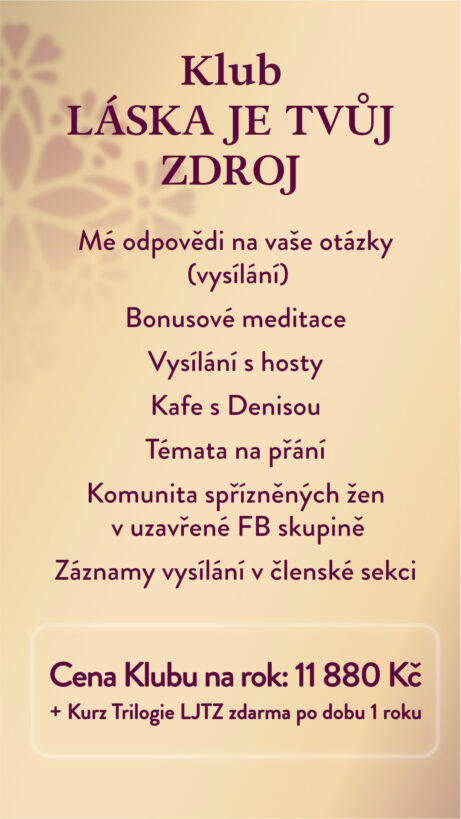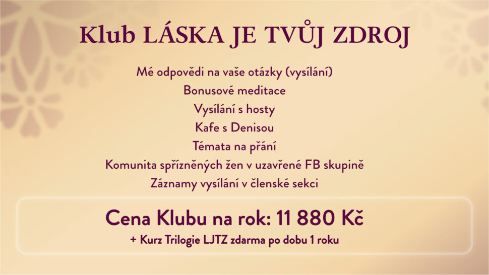 Nepřetržitý přístup k nahrávkám a meditacímPokud budeš v Klubu déle než rok, po který máš přístup do on-line programu Láska je Tvůj zdroj, budeš mít prodloužený přístup k nahrávkám a meditacím Láska je Tvůj zdroj zdarma po celou dobu, co budeš v Klubu.