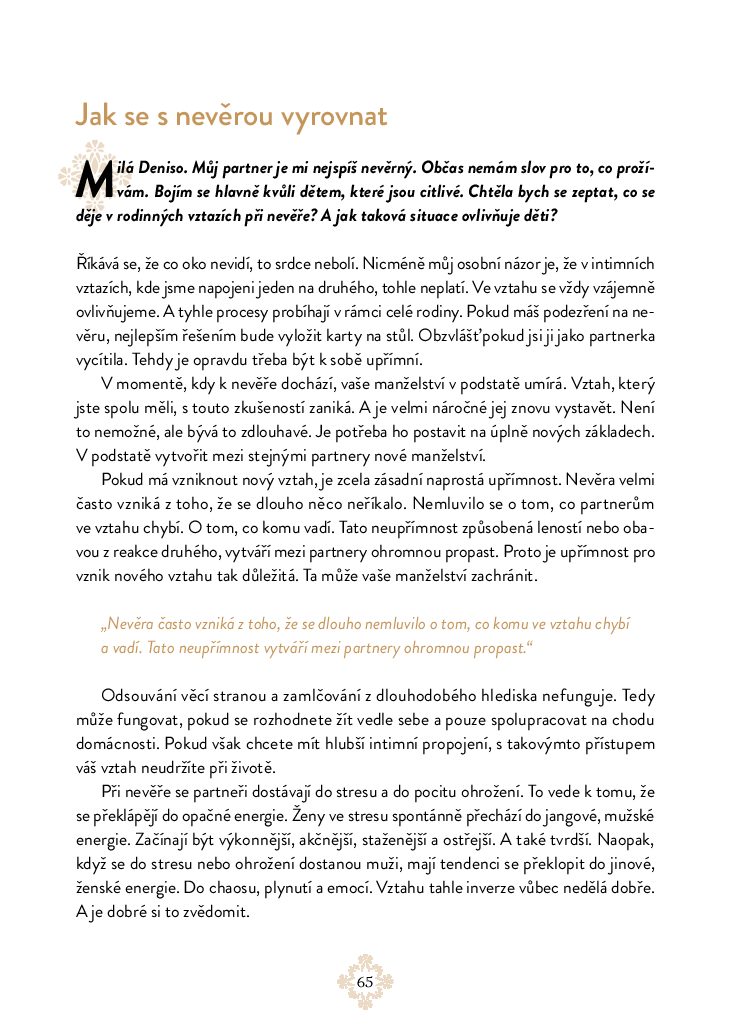 Skvělá kniha! Moc hezky se čte. Líbí se mi, jak v knize vše krásně plyne … Denisy povídání, otázky – odpovědi, různé návody, inspirační okénka, citace ... Nejprve jsem si přečetla témata, která mě v knize zaujaly hned po otevření knihy, pak jsem pokračovala i s dalšími, všechny jsou přínosné. Věřím, že pro spousty lidí bude požehnáním.