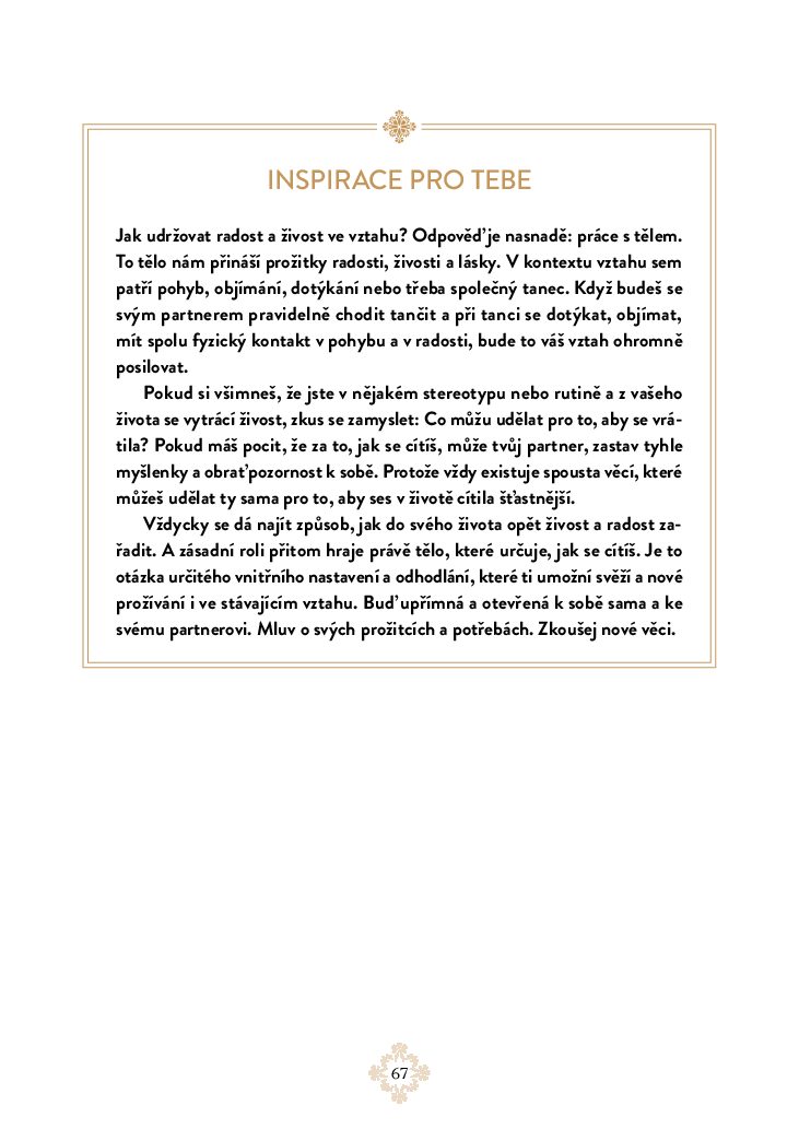 Velmi milá knížka o tom, co denně zažíváme ve vztazích. Je napsaná formou autentických otázek a odpovědí a obsahuje mnoho témat včetně těch, o kterých se leckdy mluvit bojíme, stydíme, nebo jsou společensky tabuizována. A přitom jsou zásadní pro vztah, pro spokojený život. Každý si určitě v knížce najde „to svoje“ téma, které ho nejvíc zajímá, nebo získá nový pohled na věci, které se zdály být dané. Kéž by pomohla co nejvíce lidem mít hezký, fungující vztah a žít naplněný život dle svých představ. O to tu jde především.