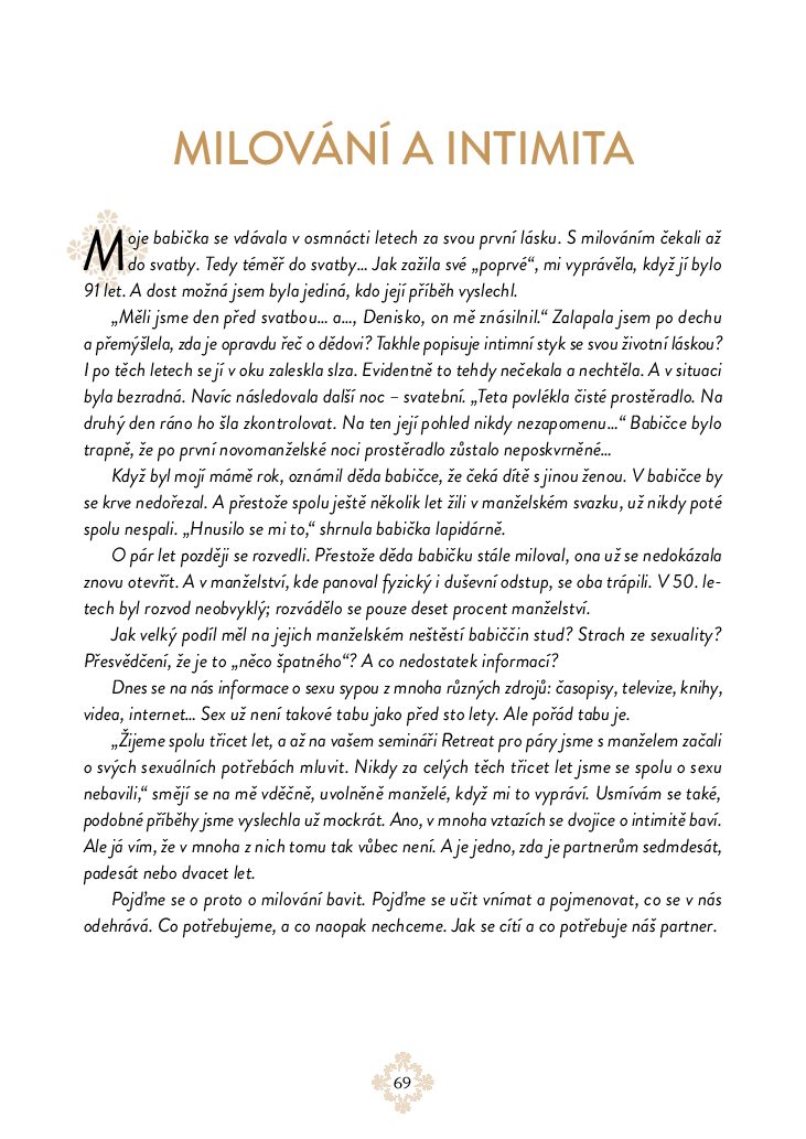 Již 20 let se jako lektorka v oblasti intimity potkávám s jednotlivci i páry, které začali poprvé mluvit o sexu a svých potřebách až díky našim kurzům. Pro mnohé z nich byla do té doby oblast sexuality tabu. A je jedno, zda je partnerům sedmdesát, padesát nebo dvacet let. Pojďme se o lásce a milování bavit. Pojďme se učit vnímat a pojmenovat, co se v nás odehrává. Co potřebujeme, a co naopak nechceme. A také, jak se cítí a co potřebuje náš partner.