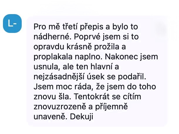 Moc děkuji za možnost projít seminářem online, protože sama za sebe vím, že bych se tolik neotevřela, kdyby vedle mě bylo plno dalších lidí. Jsem na semináři podruhé a nekončím, vždy tolik slz mnou projde, přímo gejzír. Obrovská úleva a neskutečný zážitek. Obrovská pokora, děkuji moc.