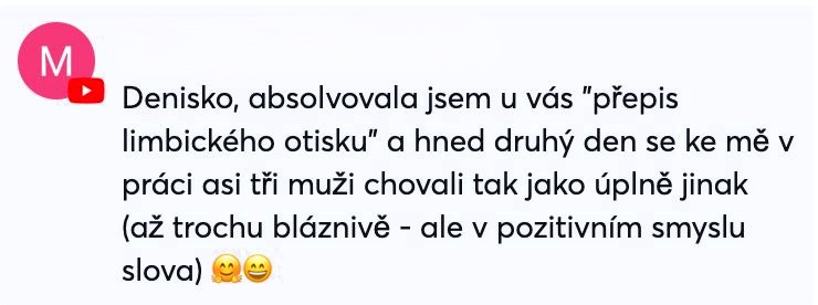 Přepis limbického otisku mě úplně dostal do kolen. Ačkoliv mám se svými rodiči výborný vztah, tak mě dlouho mrzelo, že ačkoliv mě mají rádi a kdykoliv se na ně můžu obrátit o pomoc, tak mi nikdy nedali najevo lásku, chybělo mi projevení citů, pohlazení... A přesně tohle jsem si přepsala. Po otisku jsem si připadala prostě báječně!