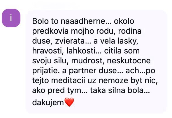 Cítím se naprosto nádherně. Během meditace jsem cítila neskutečnou lásku ode všech, kterým dávám lásku já. Mám pocit, že miluji celý svět! Neskutečná zkušenost! Naprosté ukotvení sama v sobě, vím že musím milovat především samu sebe, a pak jsem schopna rozdávat lásku dál. Mnohokrát děkuji za to, co vytváříte.