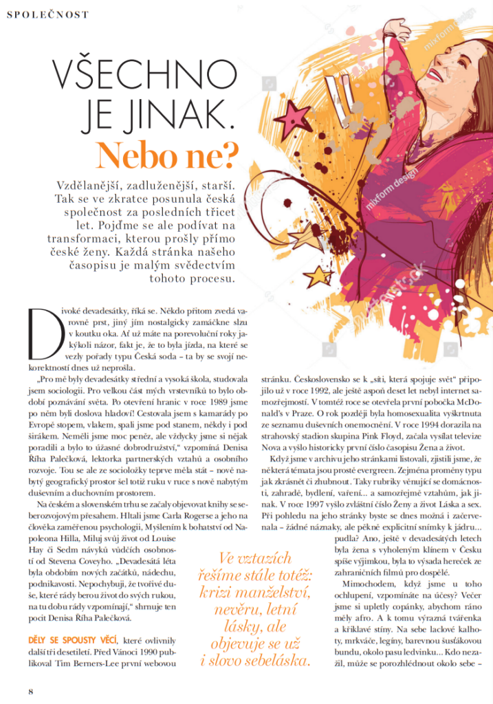 Když listuju 30 let starými výtisky Ženy a život, přijde mi, že ženy řešily totéž, co my dnes: nevěru, krizi manželství, rodičovství, seberozvoj (kariéra, změna práce, jak se prosadit), psychologie (už tehdy se objevovala sebeláska, jak nebýt loutkou, zbavit se stresu, sebevědomí…)
