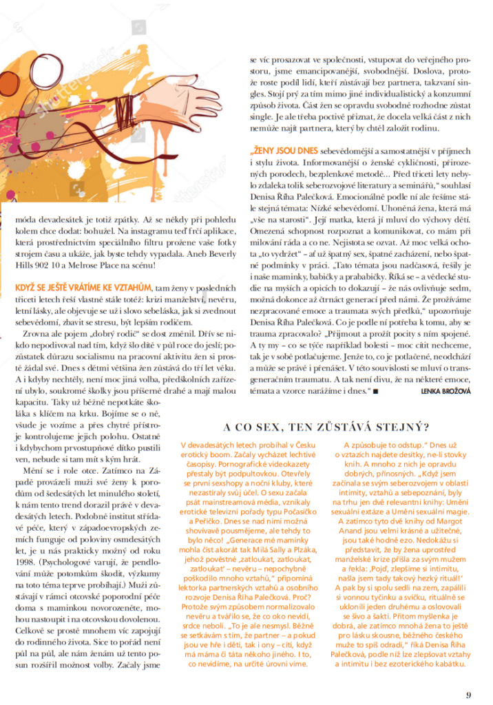 Muž na rodičovské je čím dál tím častější jev; v devadesátkách téměř nemyslitelné. V tomto se mužská a ženská role posouvají. Ale emocionálně stejně řešíme stále stejná témata! Nízké sebevědomí. Uhoněná žena, která má „vše na starosti“. Matka, která jí mluví do výchovy jejích dětí. Nízká schopnost rozpoznat a komunikovat, co při milování mám ráda, a co ne. Nejistota se ozvat. Až moc velká ochota „to vydržet“ – ať už špatný sex, špatné zacházení nebo špatné podmínky v práci. Tato témata se mezi ženami předávají po generace, a dnešní doba v tom není o moc jiná.